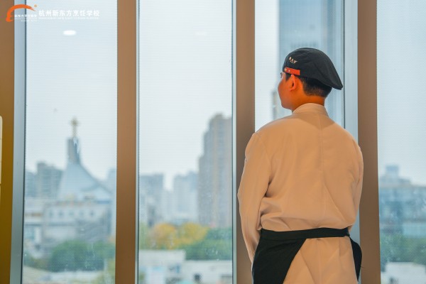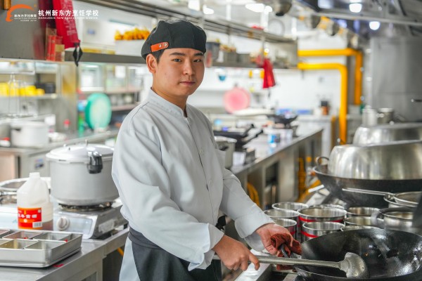 在东大方餐饮后厨,锅铲碰撞声与灶火轰鸣声中,一个年轻身影格外引人注目。他动作利落,指挥若定,手下三名员工配合默契。他就是邵冬生,今年22岁,杭州新东方烹饪学校行政总厨班周卫东老师班级的毕业生,现任切配主管,正朝着副厨的目标稳步前进。