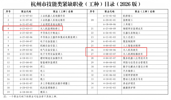 2026年3月,杭州市人社局正式发布《杭州市技能类紧缺职业(工种)目录(2026版)》,明确将无人机装调检修工、无人机驾驶员、无人机测绘操控员三大工种列入紧缺清单,自5月1日起正式实施。这意味着无人机技能人才正式纳入杭州重点扶持、高薪紧缺、补贴倾斜的核心人才序列,为广大青年打开一条低门槛、高就业、稳发展的技能成才快车道。